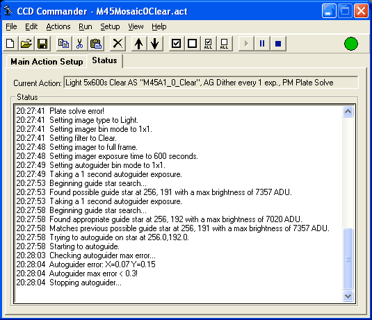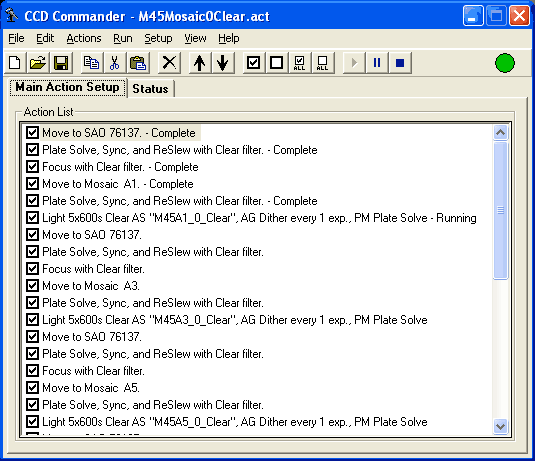 At the top of the window, CCD Commander displays the current executing action. In addition, the Green circle flashes while the action is running to let you know that everything is proceeding as normal!