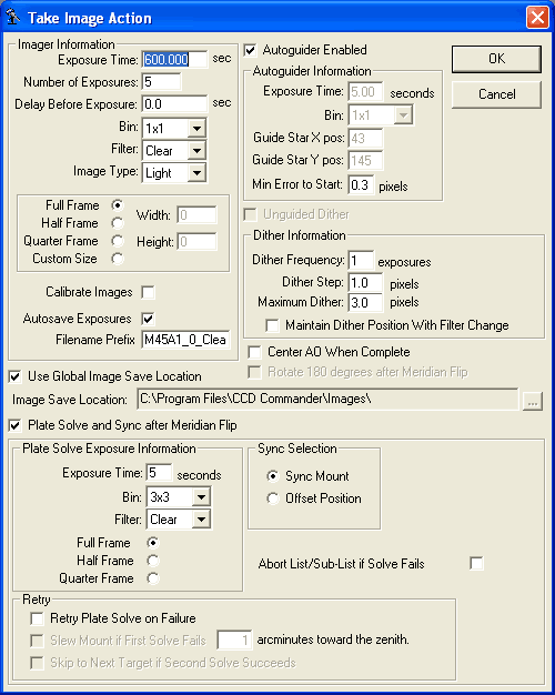 Here is the Take Image Action window where the parameters to take an image, or sequence of images, are entered. As you can see the parameters are simple to enter and mimic those common when normally setting up an image in the camera control programs. CCD Commander automatically remembers all of your entries into all of the windows so you only have to enter those parameters that have changed. Every Take Image Action you create in your Action List can be different. If you want to take some images binned 2x2 and some binned 1x1, there are no restrictions. You can take some full frame and some quarter frame. You can enable the autoguider for all your images, or just a few of them. You can even specify a different Save Path for each series of images. GEM Users: CCD Commander will always flip the mount if the meridian limit is reached during a Take Image action. However, if you want the ultimate in pointing precision, you can specify to also take a Plate Solve exposure after the meridian flip. CCD Commander will solve the image, determine the actual pointing coordinates, either Sync the mount or compute the pointing offset error, and slew to the proper coordinates. GEM & Rotator Users: CCD Commander can rotate 180 degrees after a meridian flip to keep the orientation of the camera the same. Coupled with the Plate Solve and Sync after Meridian Flip option you can be guaranteed that your original guide star will remain precisely on the guide detector!