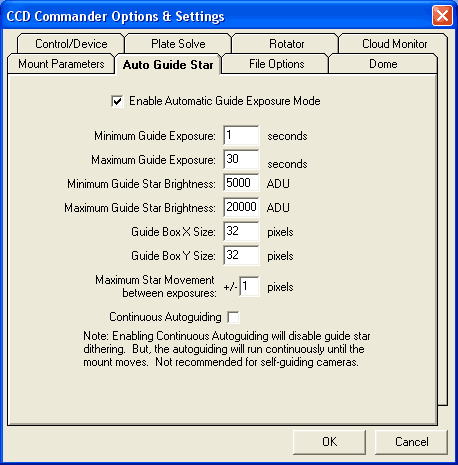CCD Commander will adjust the guide exposure for every Take Image action to achieve the guide star brightness you specify. Remember that brighter stars (with high signal-to-noise) will allow for higher precision centroid calculations. This then allows for higher precision guiding.